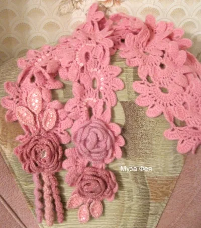 Шарфик крючком в технике ленточное кружево. Шерсть 100%, розы, листики, спиральки -из остатков пряжи. Расшит пайетками, в центре розочек - стразы.