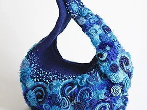 Перед тем как приступить к созданию фриформа, если он в дальнейшем пойдет в качестве отделки, например на сумку, я обязательно делаю выкройку или создаю саму сумку. В данном случае — это сумка выполнена в технике вязанного войлока Knitting felt: сначала связана, потом сваляна. Далее я беру самый крупный элемент вокруг которого буду строить свой скрамл. В данном случае — это трехцветная спираль. Кусочки которые я навязываю, должны быть соразмерны с остальными элементами, лучше их делать меньше, чем больше. Когда я навязываю достаточно кусочков, я прикладываю возможные варианты элементов, и которые мне понравились пришиваю к скраблу.