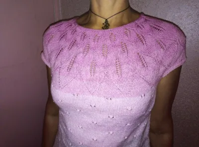 Связано по кругу: кокетка "листьями", основной узор - милые дырочки, обвязка 4р платочной вязки, а внизу в ряды платочной включила мережку - подсмотрела недавно на нашем сайте.