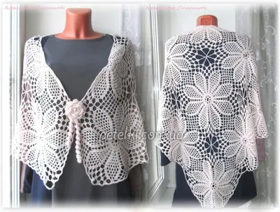 Замечательная шаль! Красивый мотив! И очень приятно что мотивов малое количество ( а не 30 — 40 ). Единственное НО для меня — в месте соединения четырёх мотивов, ну очень редкая паутинка, как ,, дырочка,,. В этом особенность круглых мотивов — или мелкий мотив добавлять или будет редкая сеточка. И в моей шали такая же особенность, но все равно красиво.