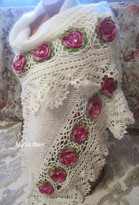 Белая шаль с розами