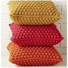 Сложить переднюю и заднюю часть изн. сторонами друг к другу и вязать по кругу: присоединить нить к углу, 1 возд.п., вязать за обе части подушки 1 ст. б/н в каждую петлю по кругу, в углы вязать по 3 ст. б/н. Провязать таким образом по 3-ем краям, вставить подушку и закончить круг.