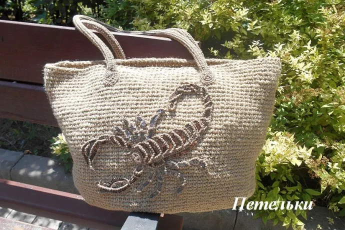 Скорпион связан безотрывно в технике фриформ, расшит пайетками 2-х цветов. На солнце поблескивает.