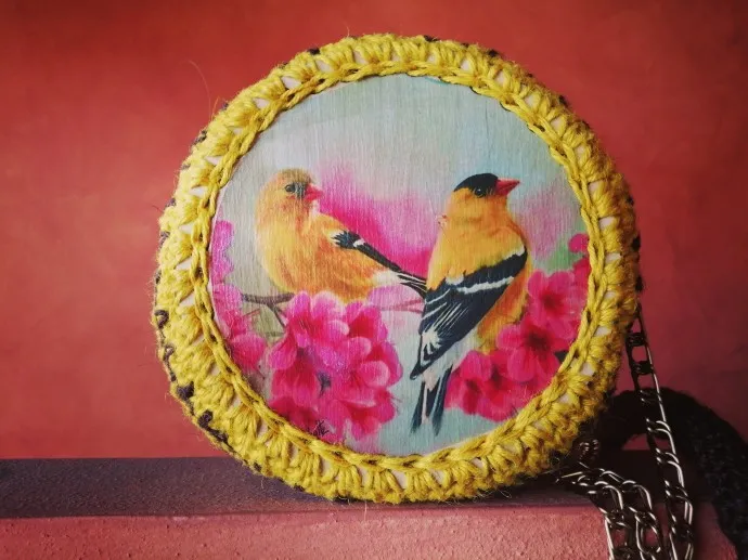 Летняя жара благотворно влияет на моё творчество. Перебирала запасы материалов и нашла пару моточков джута, деревянные заготовки и салфетки с пичугами. В итоге родилась идея новой круглой сумочки, в которой сочетаются вязание крючком и декупаж.