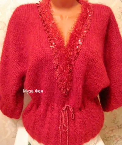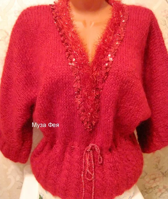Связана одним полотном на спицах. Резинка и планки на рукавах - жгуты из 4-х петель. Отделка - травка с люрексом крючком и тесьма с пайетками.