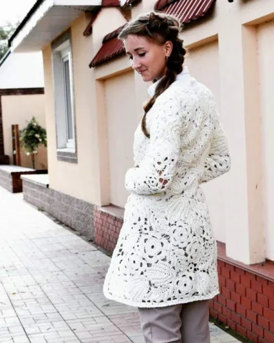 прекрасная работа. можно связать длиннее, будет пальто ( вязала я такое на заказ)