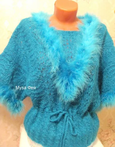 Кофточка из 70% мохера Ализе, вязка - "павлинье перо", отделка - гагачий пух.