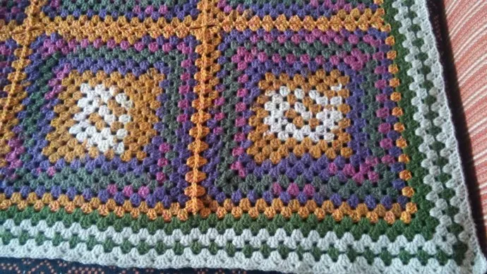 Давно купила я пряжу (Yarnart Merino Batic) специально для пледа, но никак не могла подобрать чем и каким узором вязать. Такой странный переход цветов от белого и коричневого к темным - зеленому, бордовому и фиолетовому. В мотке это было не понятно, а когда стала пробовать - ничего не нравилось. Ни спицами, ни крючком, ни шевроны, ни энтерлак... И вот, совершенно неожиданно пришло решение - вязать каждый квадрат, начиная с одной точки на пряже. Порезала я нитки и стала вязать бабушкины квадраты, начиная с начала белой секции. Может, дизайнеры так и задумали - начало белой секции было четкое, без постепенного перехода цвета из одного в другой. Но я это прочувствовала сама и хочу предложить всем, кто мучается, что связать из секционной пряжи, попробовать такой способ вязания. Квадраты получаются почти одинаковые, но в тоже время не похожи один на другой.