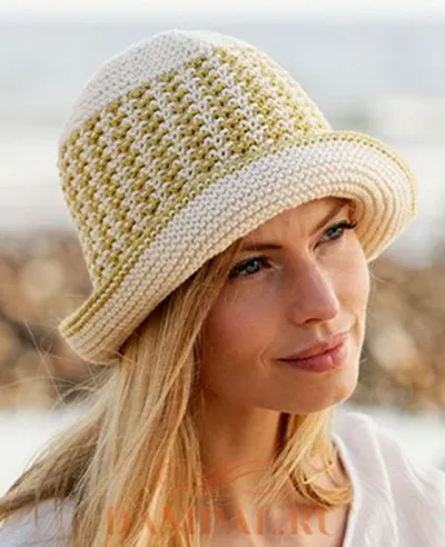 Шляпка вяжется прямыми и обратными рядами, начиная с полей. В завершение выполняется задний шов.