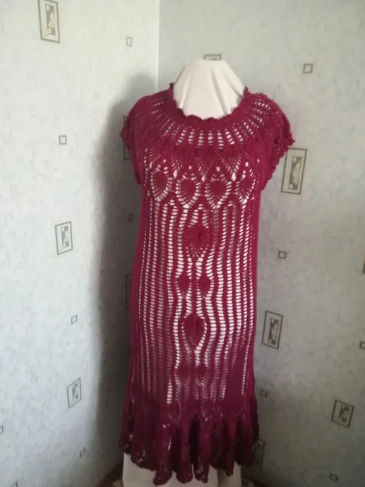 Связано из моей полюбившейся Бегонии, Ярн Арт, хлопок 100%, цвет 112 бордо, крючок 3. Ушло 8 мотков по 50 грамм, остался буквально хвостик ниток. Платье вышло длинное, по щиколотку, как и хотелось человеку.