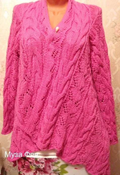 Жакет вяжется поперек в длину, как палантин, только делаются отверстия-проймы для рукавов, которые потом в них вшиваются. По краям изделия обработки нет.