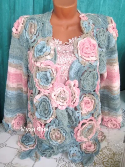 Пряжа Ализе классик суперлана батик, 25%шерсти, 75% акрил, 280м в 100г, цвет - 2970. На размер 48-50 ушло 600г. Две большие прозрачные пуговицы в виде роз застегиваются на лепестки.