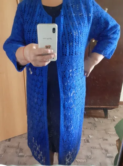 Синий удлиненный жилет, переделала в летнее пальто. Добавила к нему рукова, тричетверти, длинный рукав не стала делать. Так лучше. Рисунок вязания для рукова взяла как рисунок основного жилета, низ рукова сделала кайму такую же как низ изделия. И получилось как то так.
