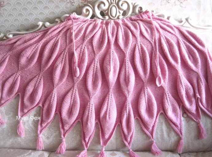 Длина до кисточек - 75см. Листики на шнурке на модели связаны спицами, я связала их крючком. Воротник на первоисточнике связан высотой 20см, мне хватило 6см. Сложить вдвое, пришить, продернуть шнурок.