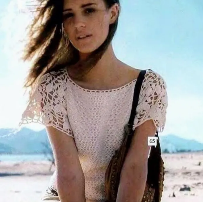 Вроде бы простой топик, но ажурные рукава придают ему оригинальность.