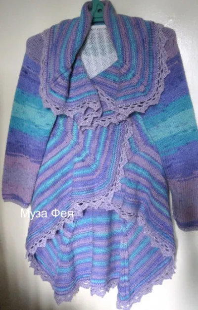 По краям жакет обвязан крючком. Можно связать край платочной вязкой или травкой. Более подробное описание вязания такого жакета-накидки - в моей теме "Жакет Дриада".