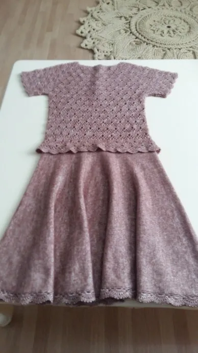 Платье для внучки (размер 146-152) связано из Итальянской пряжи Katia Air Lux MERINO extrafine (50гр/300м; 70% вискоза, 30% Lana Virgen; color 76) комбинированной вязкой. Лиф платья связан крючком N1,5 по схеме Elena star (нашла в интернете). Юбочка связана на вязальной машине поперечным вязанием и состоит из 12-ти клиньев. Сшита трикотажным швом (петля в петлю). Подол юбочки обвязан крючком тем же рисунком, что и лиф. Застегивается на спинке на 4 пуговки. На все платье пошло ровно 7 моточков пряжи.