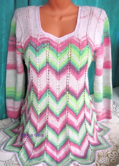 Пуловер Миссони, силуэт - трапеция(колокольчик). Связан из секционной пряжи Ализе коттон голд батик, 55% хлопка, 45% акрил, спицы №4, ушло около 400г на размер 48-50.