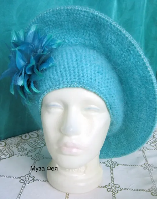 Сначала вяжем крючком колпачок, как обычную шапочку. Выворачиваем наизнанку - это будет лицевая сторона. Затем набираем цепочку по окружности головы и по кругу вяжем поля примерно 10см шириной. Сначала 2-3 ряда столбиками без накида, далее - столбиками с 2 накидами. Ввязываем в последний ряд полей ряд регилин, закрепляем его и пришиваем поля к колпачку по диагонали. Край шапочки обвязать 1 рядом ст. б/н и рачьим ходом. Если край растянется, можно продеть внутри иглой тонкую резинку-жилку. Украшение - по вкусу: бантик, брошь, цветок.