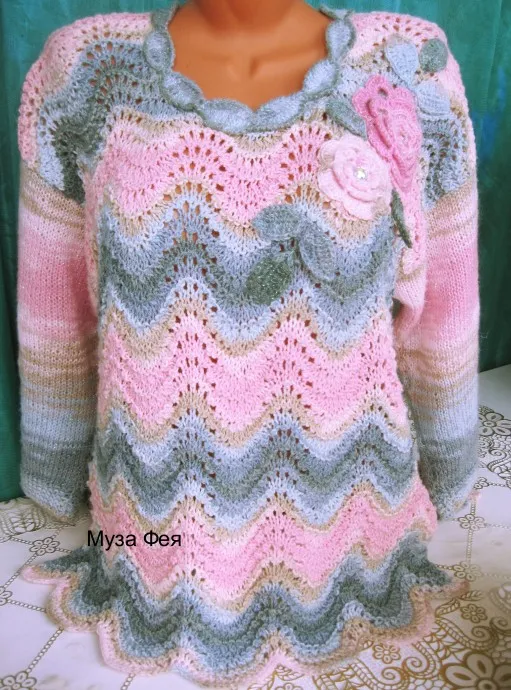 Пуловер связан на спицах из пряжи Ализе Суперлана классик батик: 25% шерсть 75% акрил 100 г. 280 м, спицы № 3,5. Ажур - "павлинье перо", очень простой, классический, но живописный и вновь очень модный узор. Отделка выреза листиками и аппликация розами - связаны крючком №3.