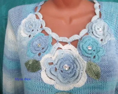 Пришить розы, листики и перышки. Вырез обвязать фестонами: звенья из 8 воздушных петель, на них - фестоны: 1п/ст, 8 ст. с 2 накидами, 1 п/ст.