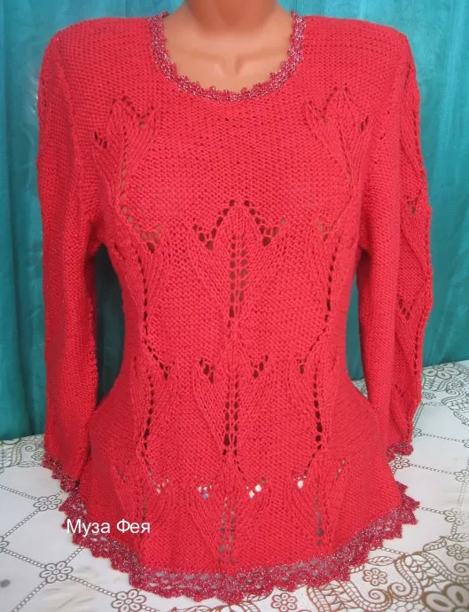 Несложный узор "тюльпан" вязать легко и приятно. Обвязка выреза, рукавов и низа - тонкой пряжей с люрексом - крючком.