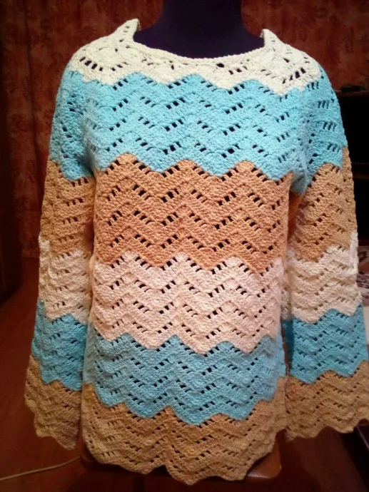 Джемпер связан крючком номер 3, пряжей Jeans 55%хлопок+45%полиакрил,идею взяла из журнала «Маленькая Diana» №4/2017. Использовала бежевый, бирюзовый и белый цвета пряжи. Начало вязания с нижнего края по кругу, рукава реглан. Израсходовано 650г пряжи.