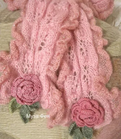 "Флоральный" шарфик связан на спицах из мохера несложным узором "листики" . Украшен розами и листиками, связанными крючком. Рюши - из петель, набранных по краям шарфика и удвоенных (из 1 краевой петли вывязать две), из более тонкого мохера.