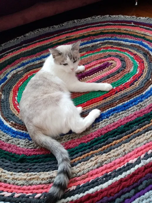 Это мой первый коврик. Вязала я его из разрезанных на полоски трикотажных вещей (свитера, платья, юбки..). Если вещь была потолще - полоски потоньше, а если вещь потоньше - полоски потолще. Пряжу нарезанную хранила на балконе в клубках. Наконец дошли ручки до создания коврика, размер 140х112 см. В процессе вязки сыпалась разноцветная пряжа, потом прошлась по коврику мощным пылесосом и никаких проблем, ничего больше не сыпется. Коврик радует домочадцев, получился мягонький, уютный такой.
