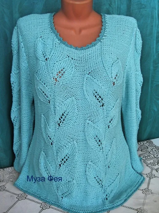 Показываю пуловер с листьями на ветках, но листики на этом узоре не параллельны, а чередуются на ветке. Оба узора красивы, но этот показался мне немного легче в вязании.