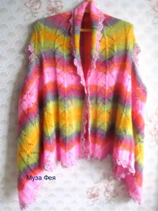 Ширина палантина - 66см, длина - 134. Вязать прямо, чередуя ажурные и изнаночные полосы. Через 45см в высоту -закрыть петли на пройму (22см) и снова набрать эти петли в следующем ряду. Далее вязать до середины спинки (от проймы будет 22см), потом вязание отложить. Вязать вторую половину жилета точно так же, затем соединить обе половинки трикотажным швом.