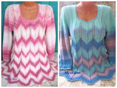 Пуловеры Миссони силуэта трапеция(колокольчик). Связаны из секционной пряжи Ализе коттон голд батик, 55% хлопка, 45% акрил, спицы №4. На сине-сиреневый ушло 350г на размер 48-50, а на бело-розовый - 500г, потому что темные участки пряжи (бордо) я отрезала. От синег-сиреневого осталось 150 г, нужно было их куда-то применить. Я добавила еще остатков пряжи и связала третий колокольчик.