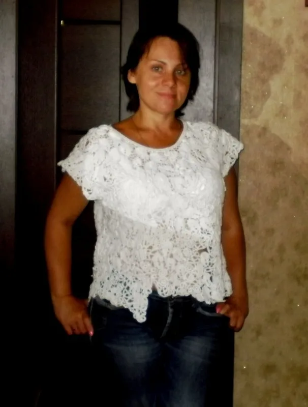 Выполнена туника в технике наборного кружева. Т.е. все элементы связаны отдельно, а потом соединены крючком в целое изделие.