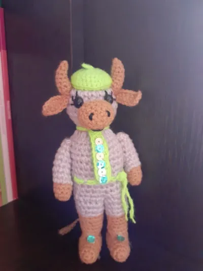Вязала, как говорят на одном дыхании. Получился смешной такой бычок. Из остатков пряжи высота его 15 см, крючок 1.5, нитки остатки детская пехорка и п/ш.45. Как - то получился настящий деревенский бычок.