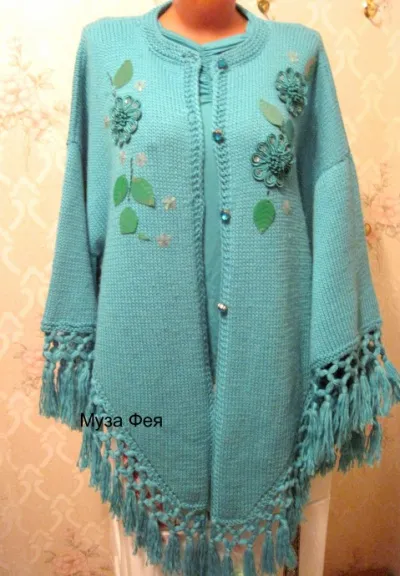 Связала пончо по журналу из п/ш бобинной пряжи. Очень простая выкройка, вязать несложно. Сделала его с застёжкой, украсила цветочными аппликациями, добавила листики и немного бисера с пайетками. Теплое и удобное.