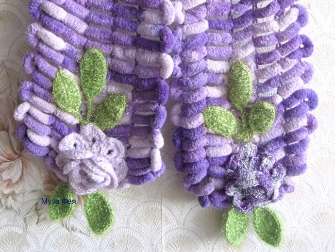 Из помпонной пряжи вязать легко и быстро. Хватает одного мотка. На толстых спицах набрать всего 6-7 петель. Кромочные петли здесь нужно провязывать. Можно украсить шарфик вязаными розами с листиками.