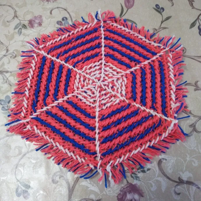 Салфетка шестиугольная плетенная на рамке.