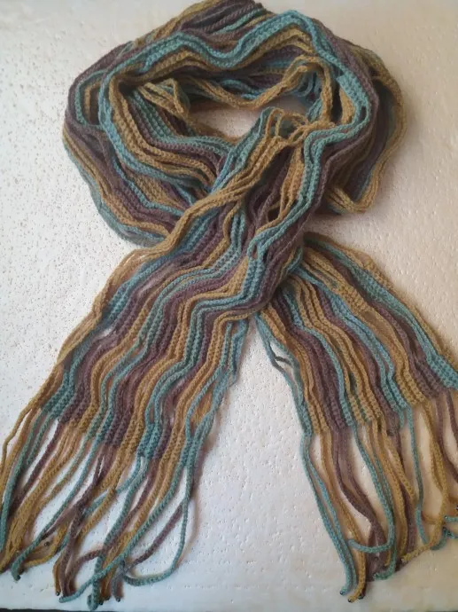 Ну что, дорогие рукодельницы, незаметно подкралась осень? Хотя у нас ещё лето продолжается, море тёплое (сегодня лично проверила!), солнышко греет, и ещё как греет - более 30 градусов! Но тем не менее календарь говорит, что наступила осень. И я, как человек предусмотрительный иногда, решила связать себе шарфик. Гуляла как-то по Леонардо, и ухватила последний моточек Подмосковной SUPERFINE принт троицкой фабрики, не устояла. Состав пряжи 50/50 шерсть с акрилом, 460 м / 100 г. Ниточка мне понравилась, мягонькая. Вязала крючком Кловер 3,5. На кончиках бахромы ввязывала бисер размер №6, для красоты, заодно и слегка оттягивает бахрому, чтобы лежала прокрасивше. Связала шарфик быстро, за 3 вечера.