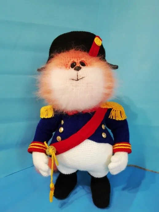 Бонапарт связан крючком, стоит самостоятельно на проволочном каркасе. Лапки и хвостик сгибаются. Высота 50 см.