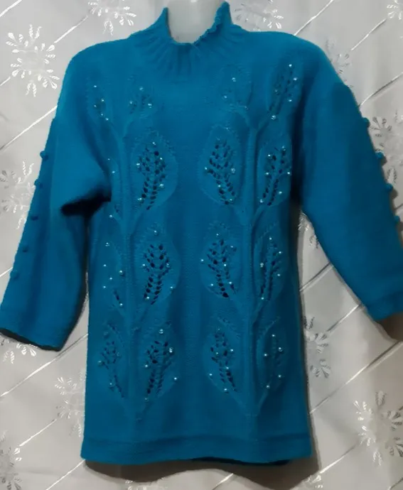Помните мой бирюзовый пуловер для дочери? Получилось продолжение. Некоторым подругам понравился, попросили связать такой-же. Благо, что живут в разных городах, редко встречаются. Вот и связала почти похожий. Добавила бусинки в листики и, как мне кажется, этот "веселее" получился. Пряжа слонимская полушерсть, расход на 48 размер 600 г.