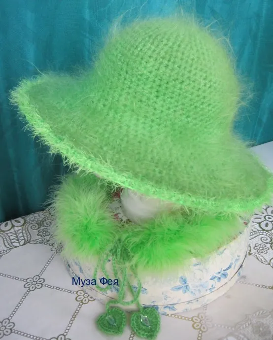 Шляпка крючком из мохера Ализе 70% в две нити, поля отделаны травкой. Можно связать шляпку из шерсти или другой пряжи. Вяжем тулью высотой 20см, затем - поля. Они должны быть меньше полного круга см на 5-7. Если связать полный круг, края шляпки получат сильный изгиб, как в шляпках из оперетты.