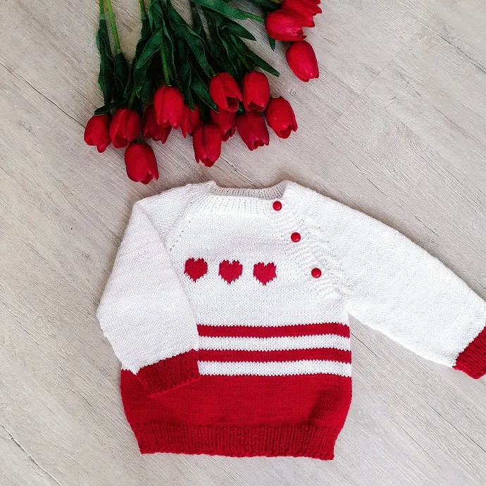 Связала из полухлопка,пряжа Nako calico. Сверху вниз,одним полотном,реглан.Сбоку сделала планочку,чтобы малышке было легче одеваться.После ВТО получится очень тактильно мягким и приятным.