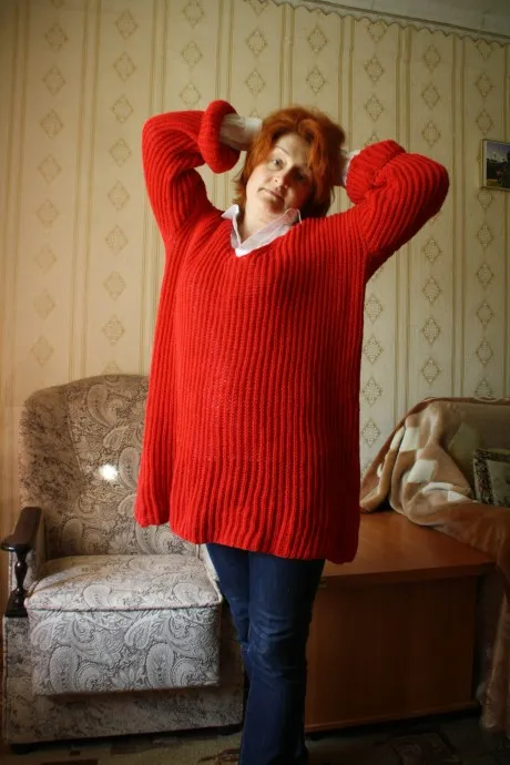 Немного технических характеристик: ниточки Alize Latacoton, 160 метров в 50 граммах, 26% шерсти, 26% хлопка, 48% акрила, цвет 56 - яркий красный, расход 500 граммов; спицы №4. Изделие сшивное, связано снизу английской резинкой (я её вяжу во всех рядах - и лицевых, и изнаночных - одинаково: изнаночная изнаночной, лицевая - в лицевую рядом ниже, петли "бабушкины"), сборку по плечам сделала тамбурным швом, швы на рукавах (вязала не по кругу, а поворотными рядами) и боковые швы - крючком с изнанки.