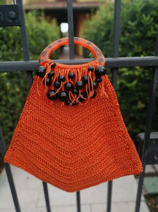 Сумка из пэ шнура, крючок н. 3,5, стсн. Пластиковые ручки в тон пряжи. Украшение - деревянные бусины разного размера. Внутри для удобства подкладка с карманом.