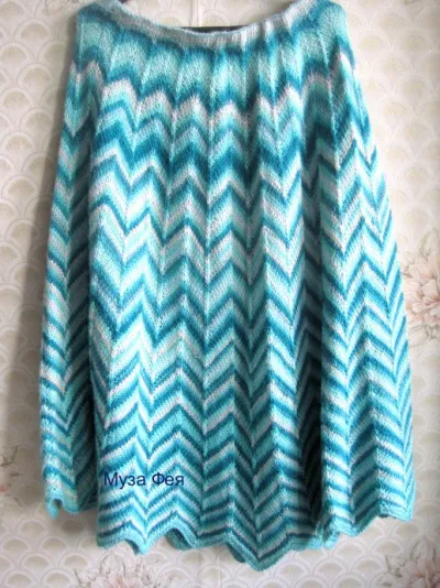 Набрать 260п + кром, связать 3-4 ряда платочной вязкой, затем перейти на вязку-зигзаг. Сначала раппорт состоит из 26п, вяжем прямо см 20, затем в убавках провязывать не по 3петли вместе, а по 5. Таким образом постепенно количество петель в раппорте убавляется до 10п.