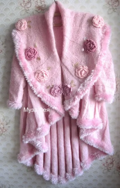 Накидка из турецкого мохера Ярнарт (70% мохера, 30% акрила, 220м/100г) -750г и травки - около 200г. Отделка - розы крючком. Длина - 153см, ширина - 145см. Круговые спицы №3,75, длина 120-150см - желательно две пары, так как последние ряды очень длинные.