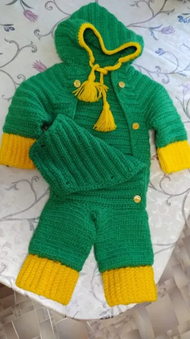 Комбинезончик для новорожденного связан из акриловых ниток зеленого цвета,крючком №3,столбиками с накидом. Отделан желтыми нитками.Застегивается на пуговки.На возраст от 0 до 6 мес.