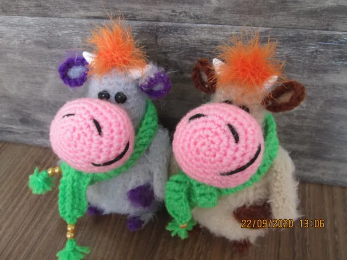 пока в нем два бычка и несколько коровок, игрушки связаны крючком из КТХ, имеют небольшие размеры и могут использоваться как подвески, брелки или сувениры к НГ