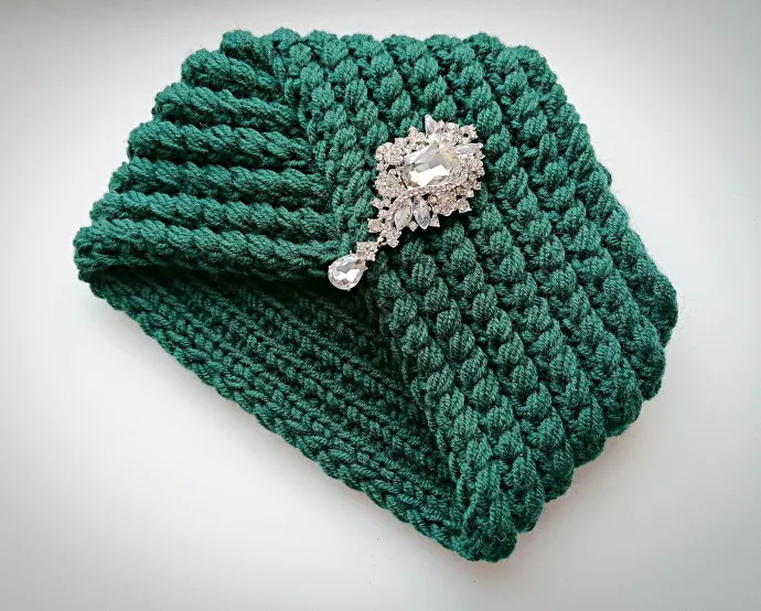 Шапка-чалма связана спицами, шикарным объемным рисунком и украшена сверкающей брошью