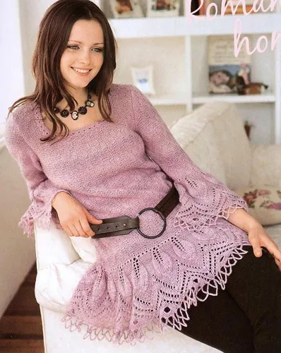 Туника с листьями связана на спицах. Есть два варианта - азиатский (розовая) и наш (голубая).